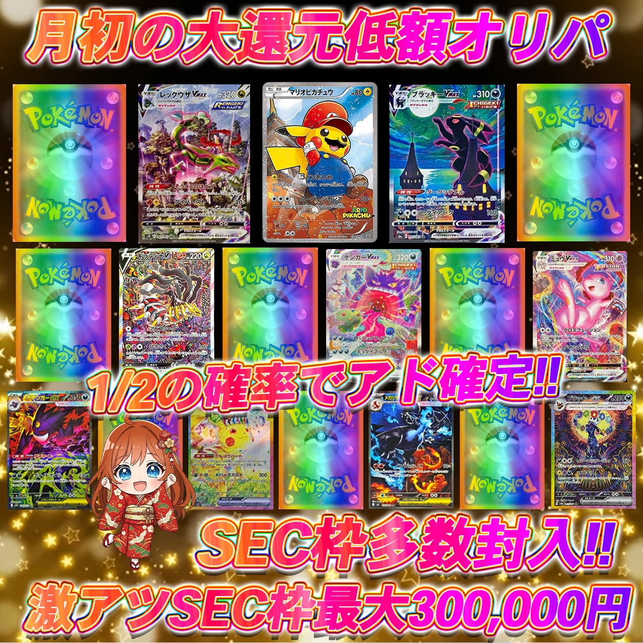 ポケカ月初の大還元低額オリパ!! ポケモンカード 1/2の確率でアド確定!! SEC枠最大300,000円!!